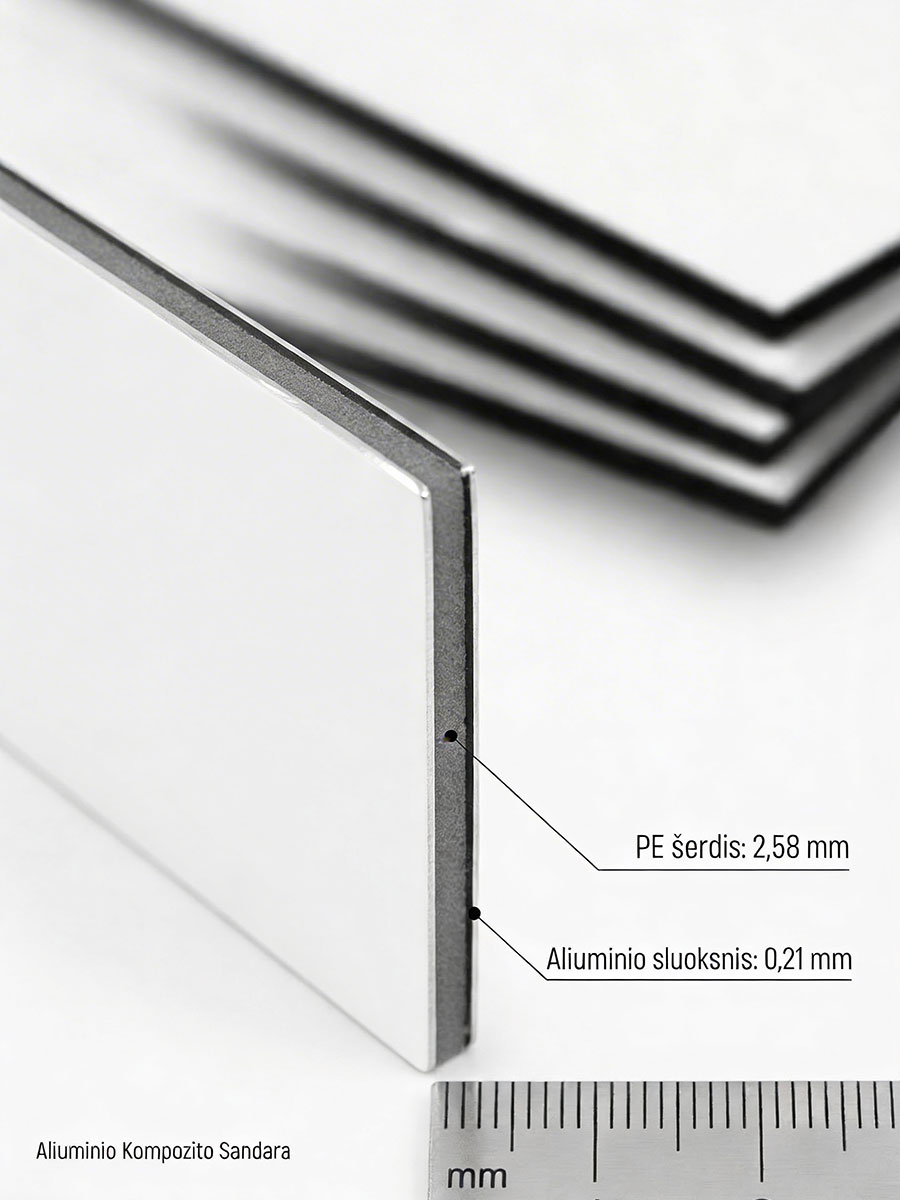 2 arba 3mm storio aliuminio – polietileno – aliuminio kompozitinės plokštė su poliesterio danga. Įvairių spalvų paletė, vienpusiai ir dvipusiai. Plačiai naudojama reklamos gamyboje, pasižymi dideliu stiprumu, labai gerai išlaiko plokštumos lygumą, yra lengvai apdirbamas. Naudojama įvairių informacinius stendų, šviesdėžių pagrindų, iškabų, nuorodų kt. gaminiams. Frezuojame ir fasadinį 4 mm aliuminio kompozitą.