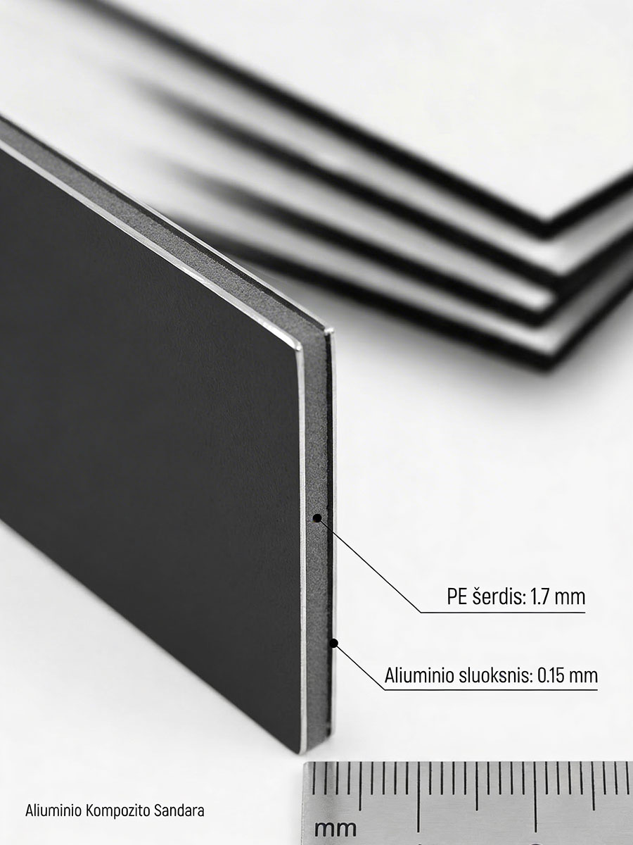 2 mm storio aliuminio kompozito plokštės vidinis užpildas pagamintas iš perdirbto polietileno plastiko, kuris neturi toksiškų junginių ir yra saugus naudoti vidaus sąlygomis. 0,15 mm storio aliuminio sluoksniai suteikia plokštei spalvą, apsaugo nuo aplinkos poveikio ir užtikrina konstrukcijos standumą.
